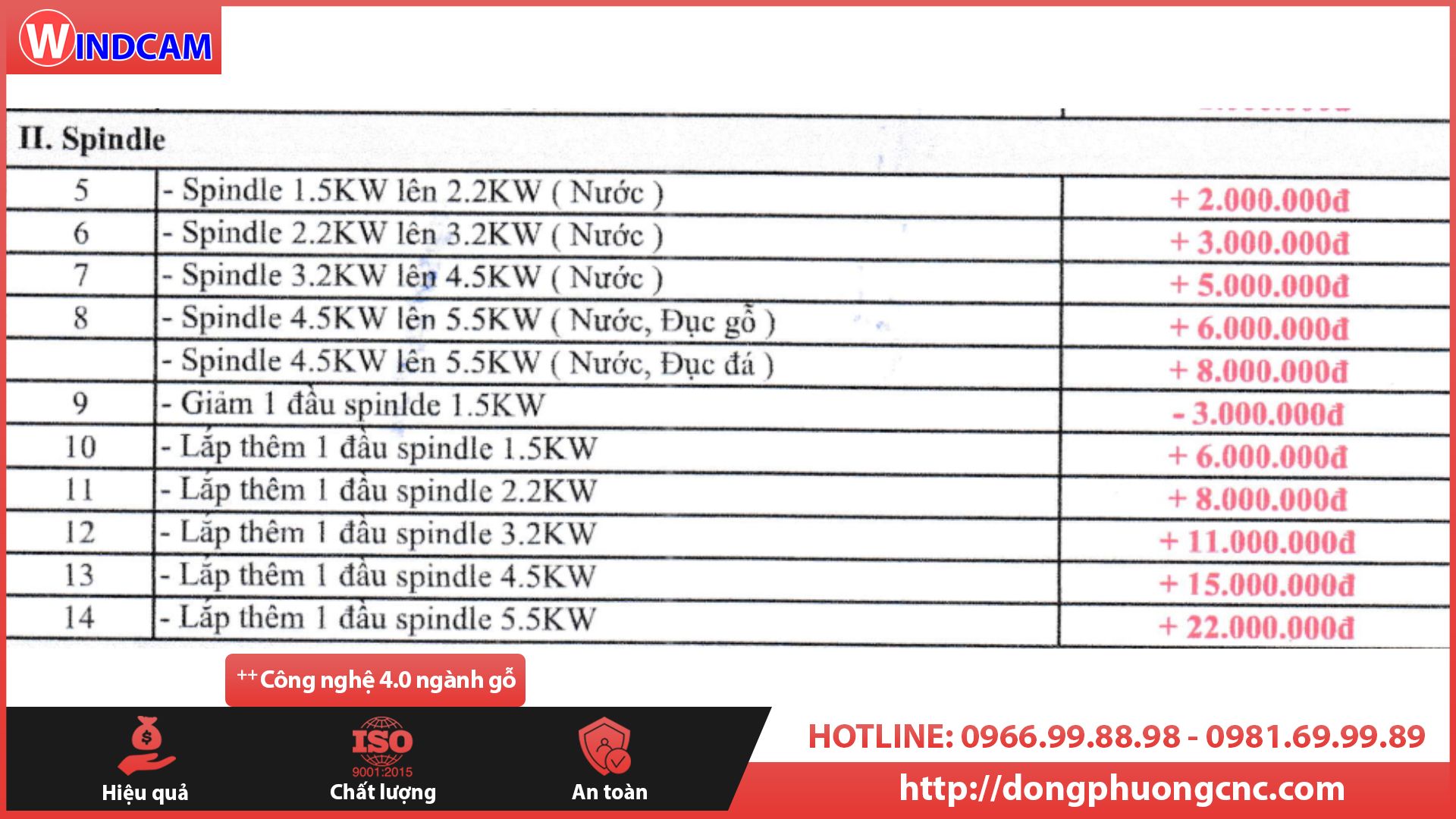 Với cấu hình chuẩn về dòng máy 3D, được trang bị công suất 1.5kw, dòng máy đục tượng 4D được trang bị công suất 2.2kw, và 1 số dòng máy khác,... Còn tùy thuộc vào sản phẩm khách hàng gia công mà có cần nâng cấp công suất củ đục sao cho phù hợp hay không. Thì khách hàng có thể tham khảo mức giá chi tiết về nâng cấp Spindle ngay ở bảng bên dưới như sau: