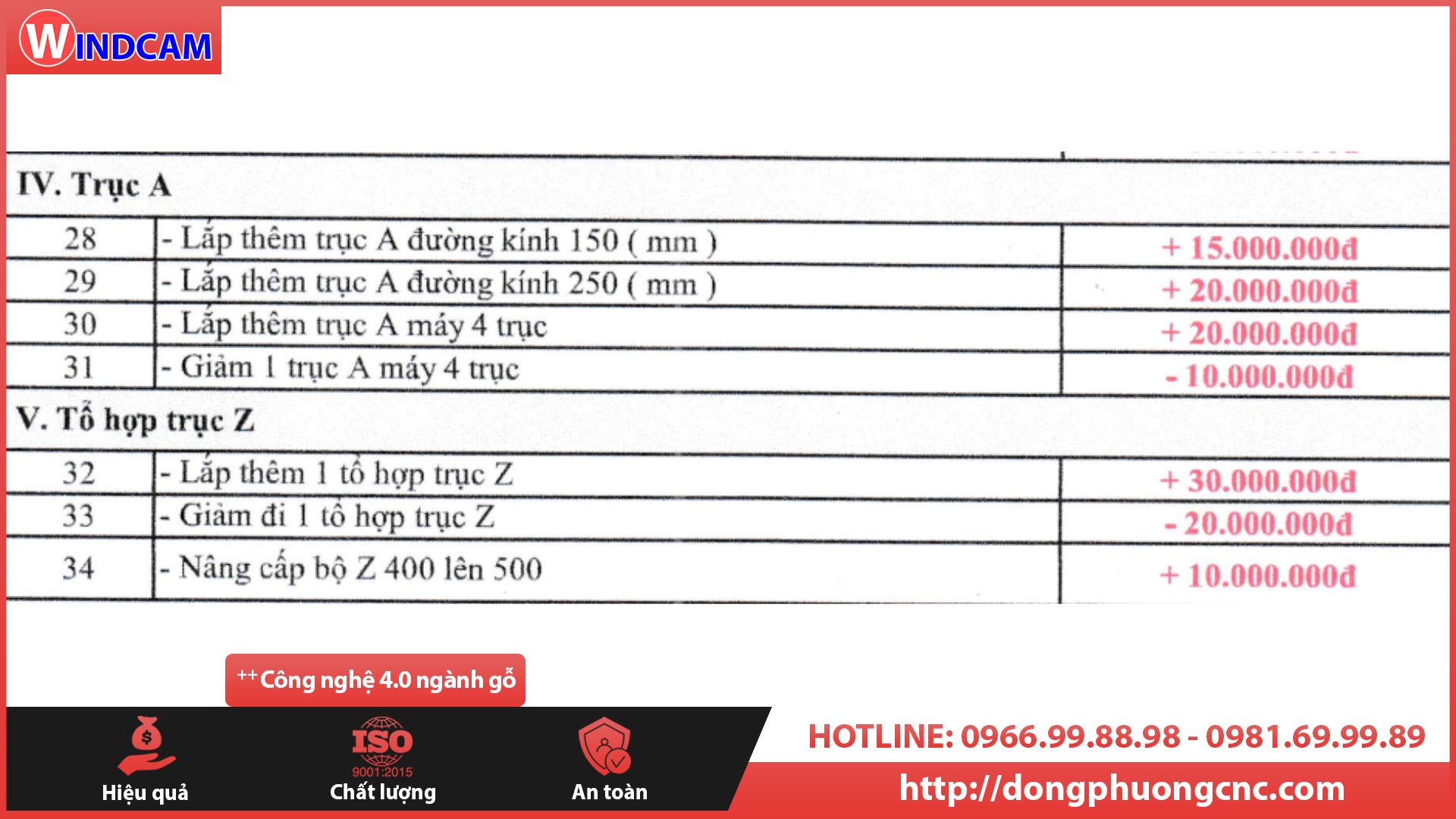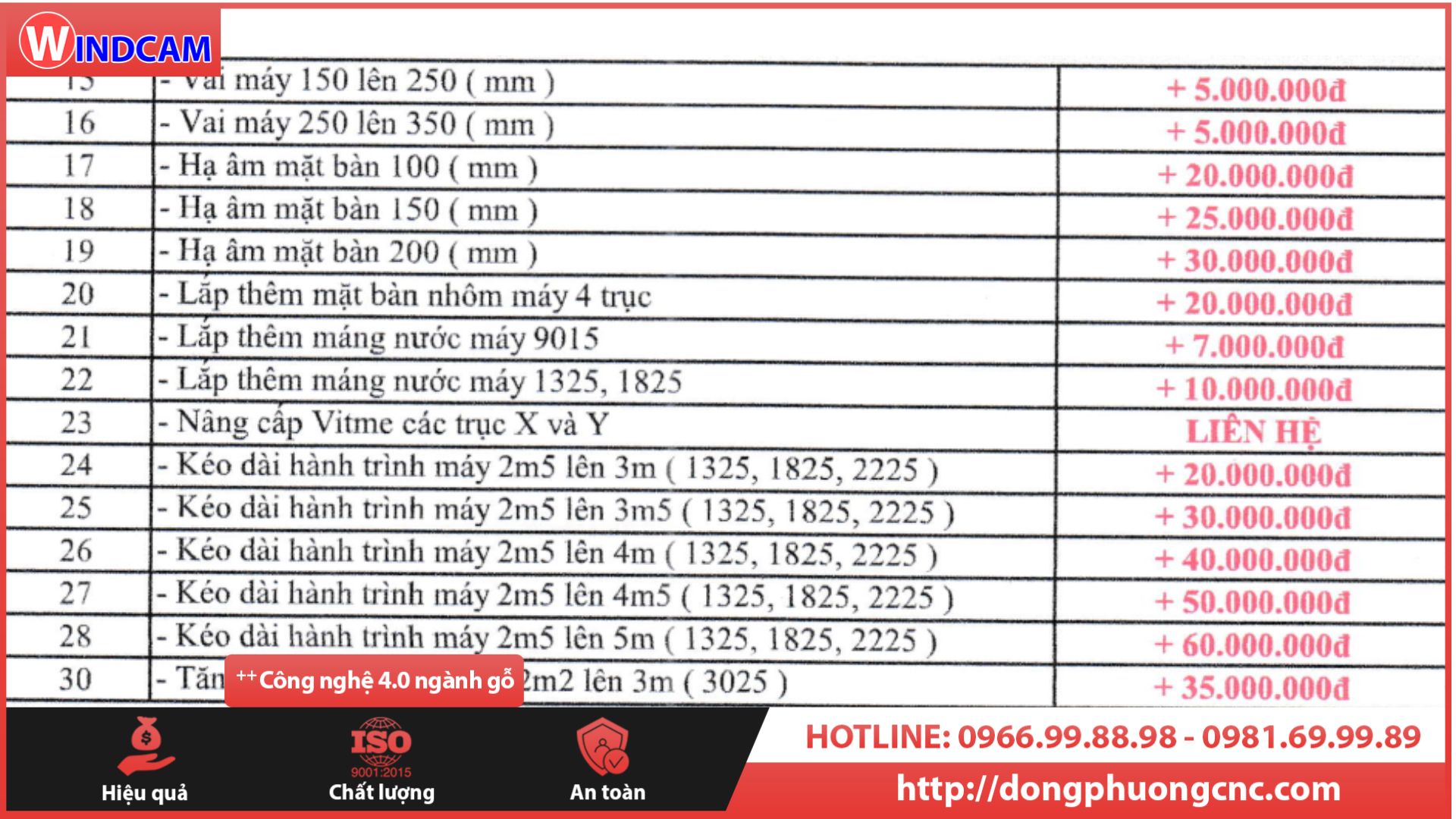 Khách hàng có thể tham khảo giá nâng cấp vai máy và mặt bàn máy cụ thể như sau: