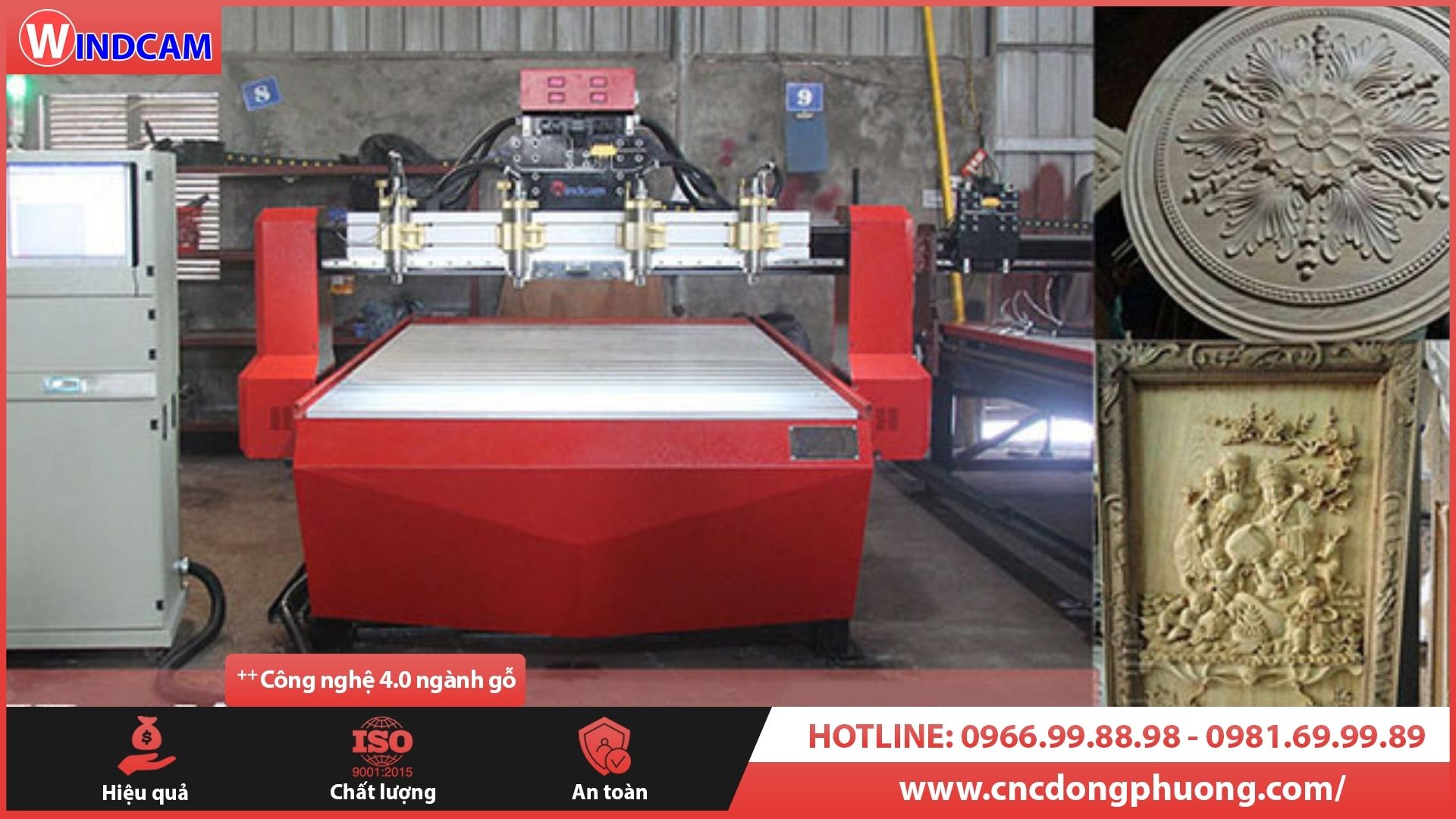 - Cấu hình máy hiện đại, khổ máy vừa phải 1550 x 2440 gia công đa dạng các sản phẩm 3D như bàn ghế, giường tủ, mâm trần, tranh gỗ, đồ thờ,... Linh kiện nhập khẩu chính hãng. Phần mềm CA100 Pro giao diện Tiếng Việt, củ đục thương hiệu Windcam độc quyền,...