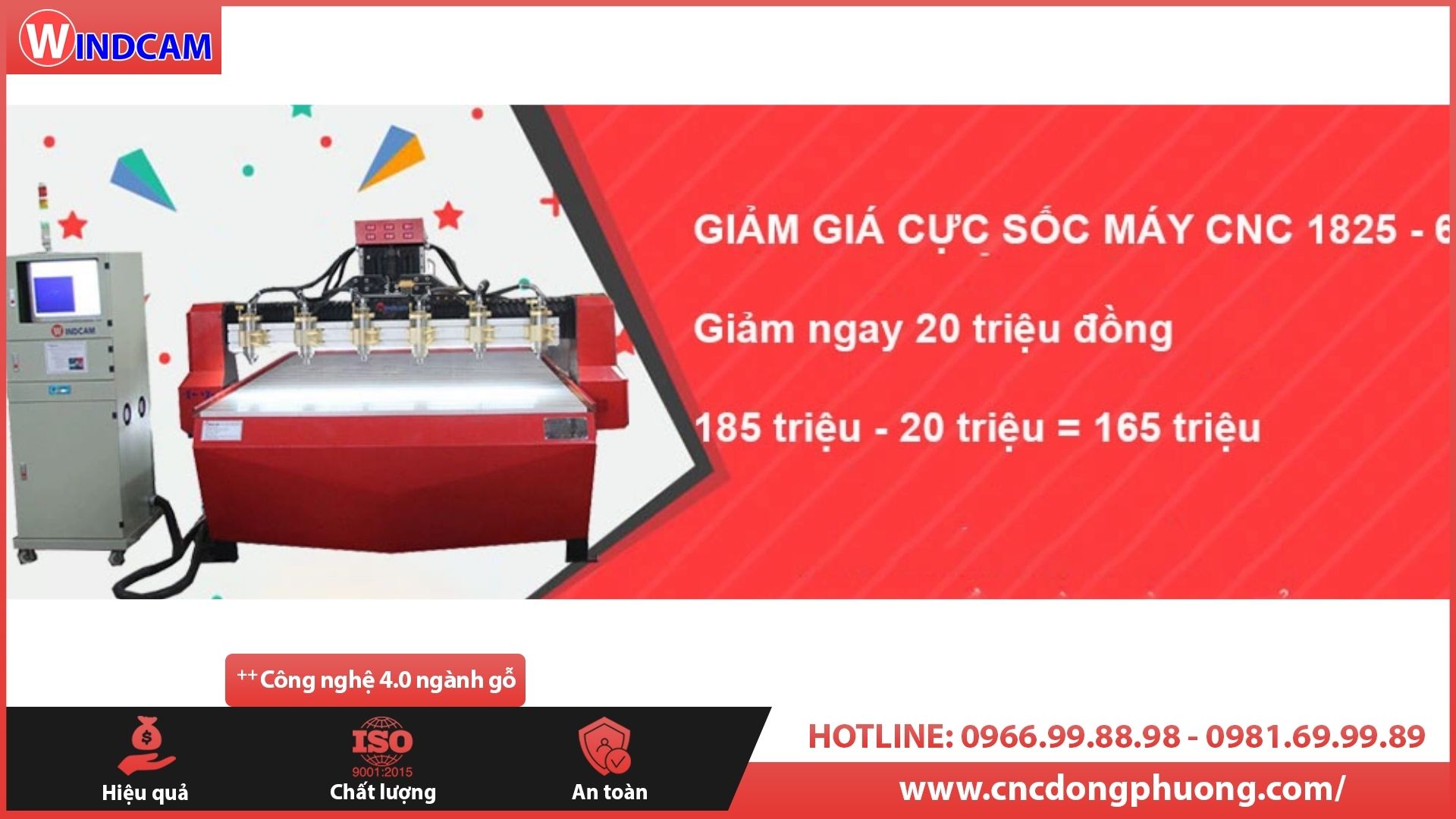 - Dòng máy CNC 1825-6: đang được giảm giá 20 triệu đồng, chỉ còn 165 triệu. Dòng máy này có khổ làm việc 1800 x 2500 và kết hợp 6 đầu đục. Máy sử dụng phần mềm điều khiển CA100 với giao diện hoàn toàn Tiếng Việt dễ dàng sử dụng.