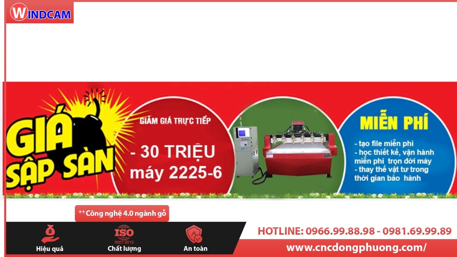 - Dòng máy CNC 2225-6 đang được giảm giá 30 triệu đồng, chỉ còn 170 triệu đồng. Đây là dòng máy có khổ làm việc lớn, 2200 x 2500 mm kết hợp 6 đầu đục công công suất 1.5kw có thể đục sâu phôi gỗ tới 4cm. Quý khách hàng có thể nâng cấp công suất lên 2.2kw để đục sâu phôi gỗ lên tới 7cm.