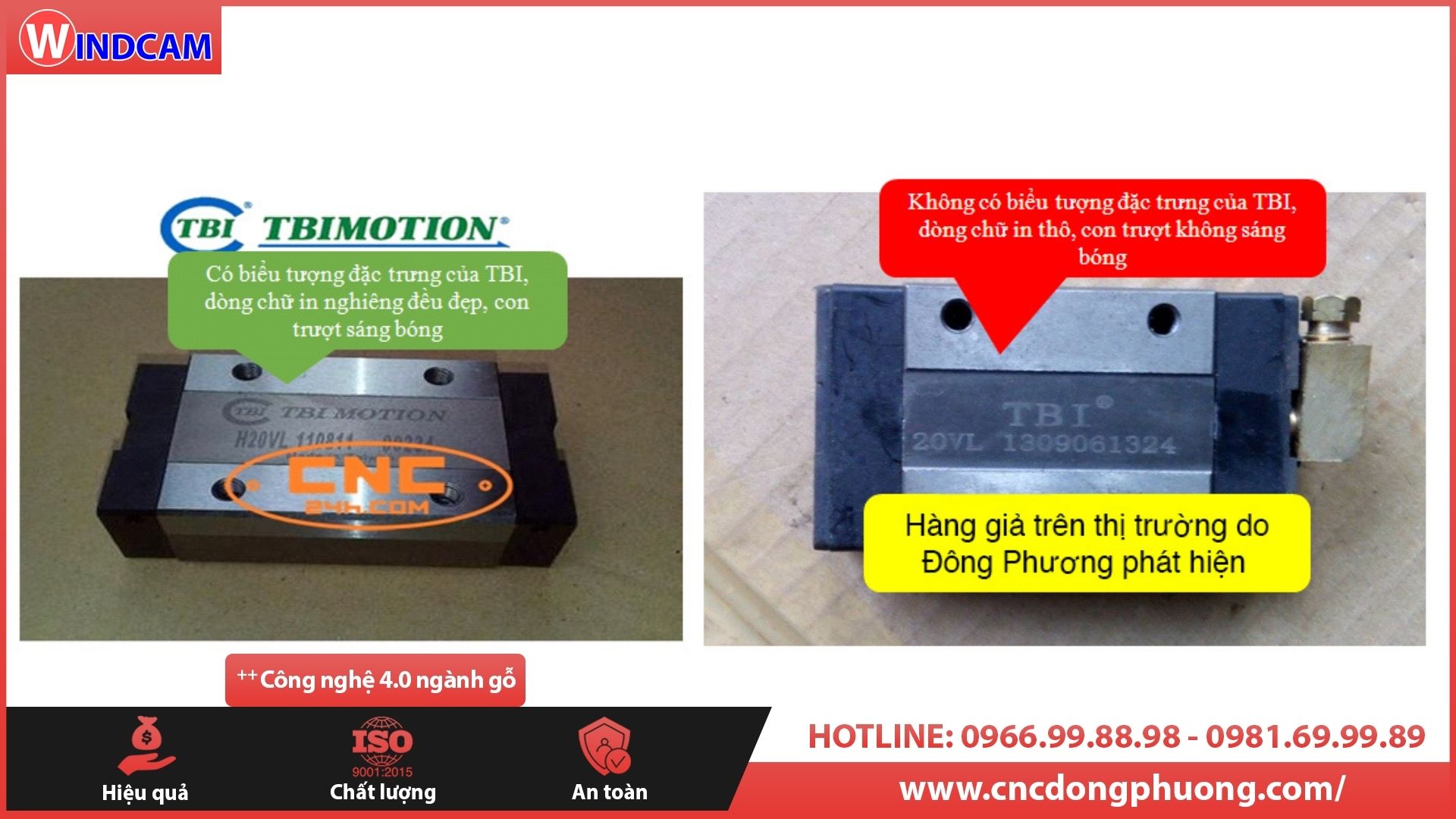 Con trượt, ray trượt TBI chính hãng sẽ có biểu tượng đặc trưng vưới dòng chữ in nghiêng rất đẹp, sáng bóng. Còn con trượt TBI làm giả sẽ không có logo của hãng TBI, chữ con trượt không được sáng bóng.