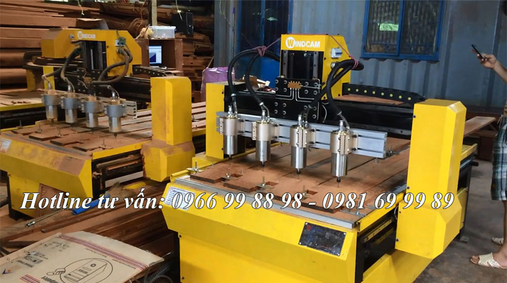 Máy CNC sử dụng 4 đầu khắc với công suất 1.5Kw có thể đục sâu tới 4cm, Củ đục mang thương hiệu Windcam, giúp các bợ thợ mộc gia công một cách ổn định và nhanh chóng.
