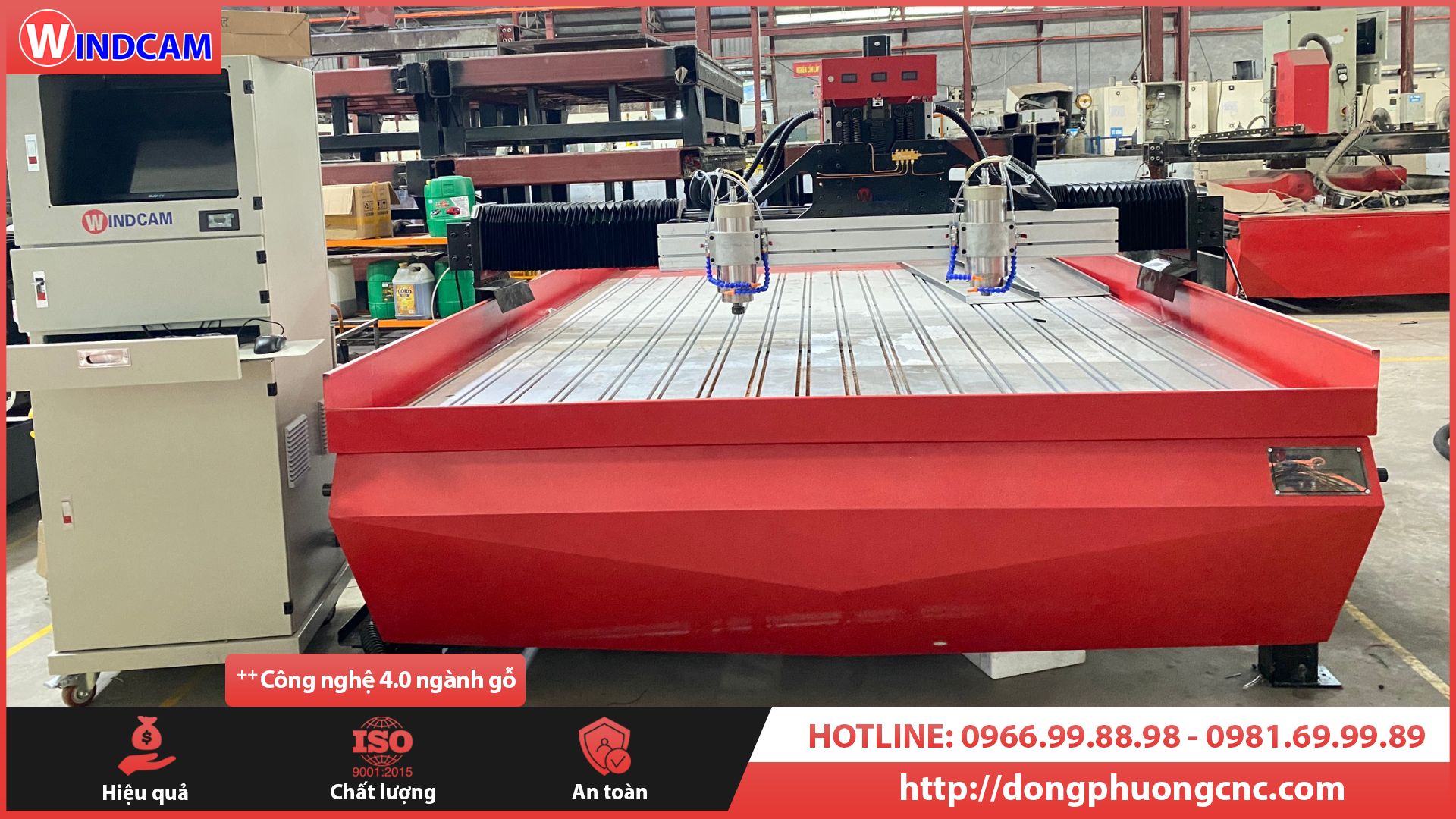 Cỗ máy CNC đục gỗ bán chạy nhất tại CNC Đông Phương Hà Nội. Với thiết kế hành trình gia công chiều rộng 1550mm chiều dài 2440mm. Vai máy cao 250mm phù hợp với sản phẩm gỗ phôi cao 200mm. Kết hợp 4 củ đục Spindle cho ra 4 sản phẩm cùng lúc giống nhau. Mỗi củ đục Spindle có công suất 1.5kw er16 của hãng GDZ tất cả đều được in logo thương hiệu Windcam.
