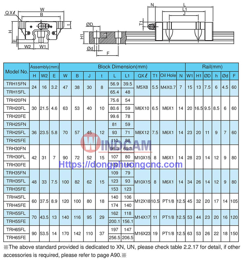 Thông số chi tiết con trượt vuông TBI FL/FN