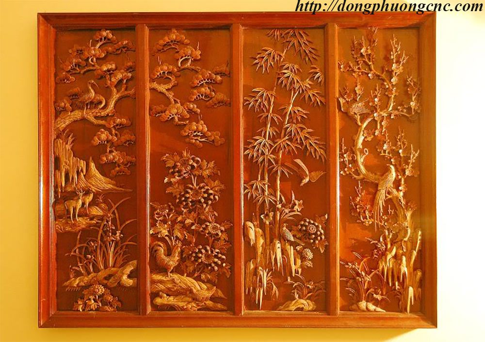 Bộ tranh Tứ quý Tùng - Cúc - Trúc - Mai bằng gỗ thể hiện bản chất chính trực và thanh cao của người quân tử. Ý nghĩa của bức tranh này được giải thích như sau : Tùng đứng thẳng trong gió rét tượng trưng cho bản chất ngay thẳng và chính trực của người quân tử, Cúc tàn nhưng không rụng thể hiện chí khí của người anh hùng, Trúc dù trong bất kì hoàn cảnh nào thì vẫn luôn xanh mát tượng trưng cho sự thẳng thắn của người quân tử, Mai nở trong mùa đông giá lạnh tượng trưng cho sự giàu sang và tấn tài tấn lộc.