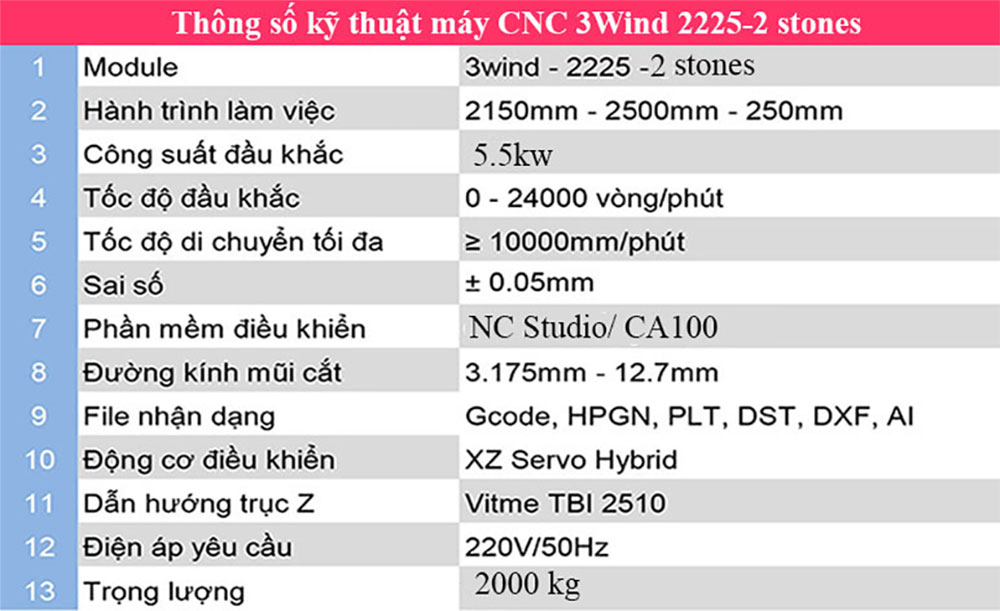Máy cnc khắc đá có cấu hình cơ khí chắc hơn những dòng máy cnc thông thường. Đặc biệt chất liệu của máy làm việc là đá - cứng hơn gỗ, vậy nên công suất Spindle có công suất lớn lên đến 5,5kw