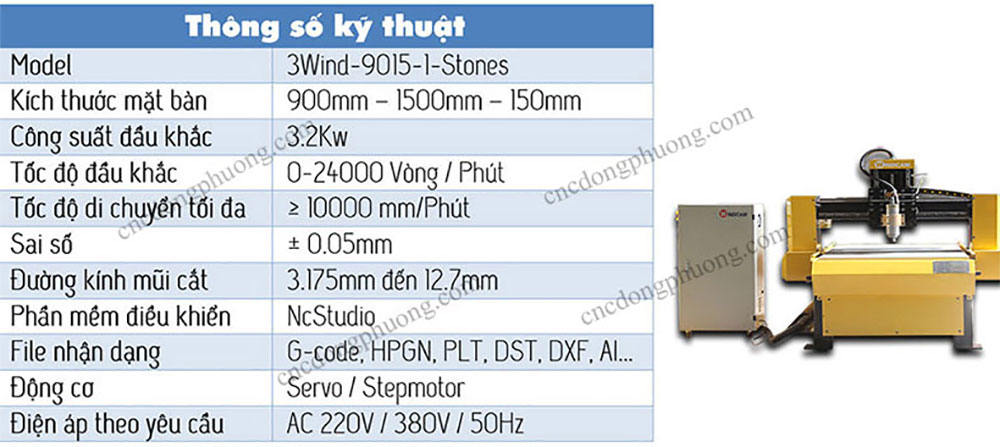 Máy khắc đá cnc mini 9015–1 của công ty Đông Phương hiện được bán với giá 116 triệu. Đây là giá bán tại xưởng sản xuất của công ty Đông Phương, chưa có chi phí vận chuyển và VAT