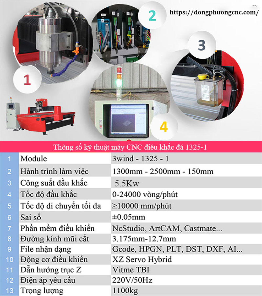 Động cơ trục X,Z: AC Servo chống nhảy bước mất bước rất tốt. Máy cnc khắc đá thường chỉ lắp từ 1-2 Spindle chứ không quá nhiều như máy khắc gỗ thông thường. Cấu hình cụ thể như sau: