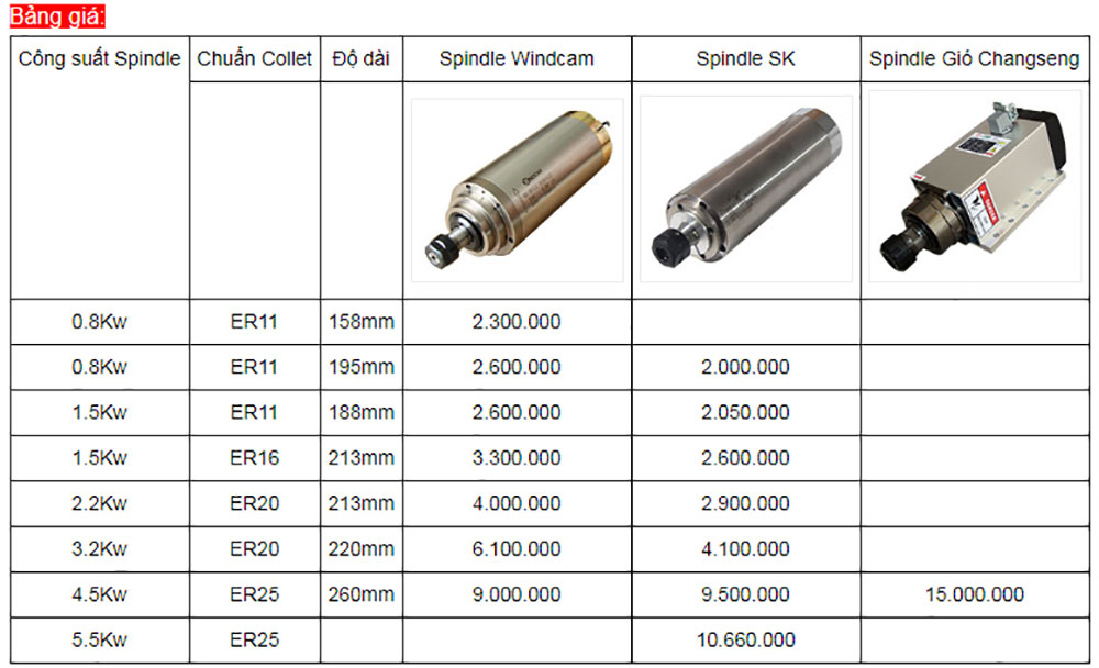 - Có hai loại spindle : dòng 220V, dòng 380V.