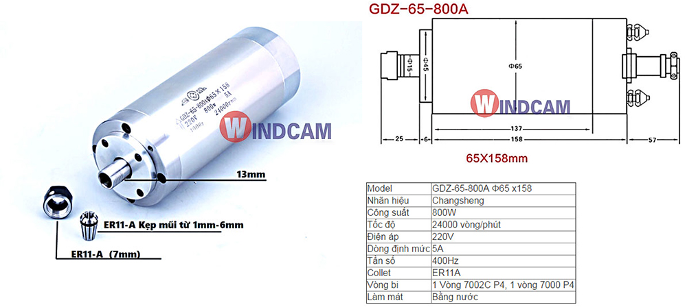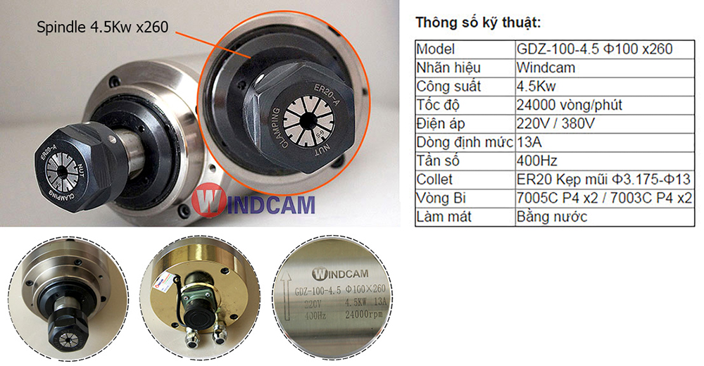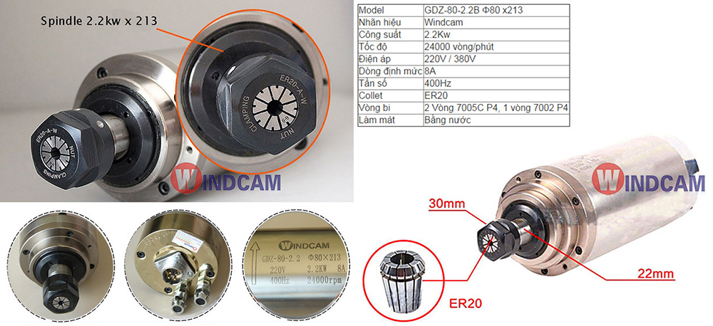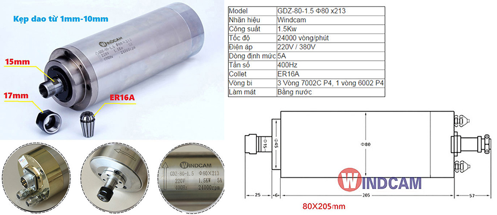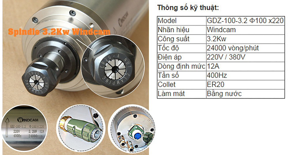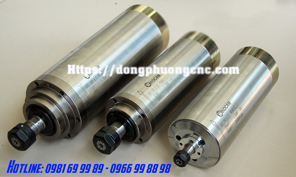 Spindle làm mát bằng nước (Water cooled spindle ) hay còn gọi là củ đục, động cơ trục chính, củ động cơ, đầu đục...dùng cho các loại máy cnc, máy cnc khắc gỗ, máy cnc điêu khắc, máy cnc khắc đá, máy cnc quảng cáo...Spinlde mang thương hiệu Windcam.