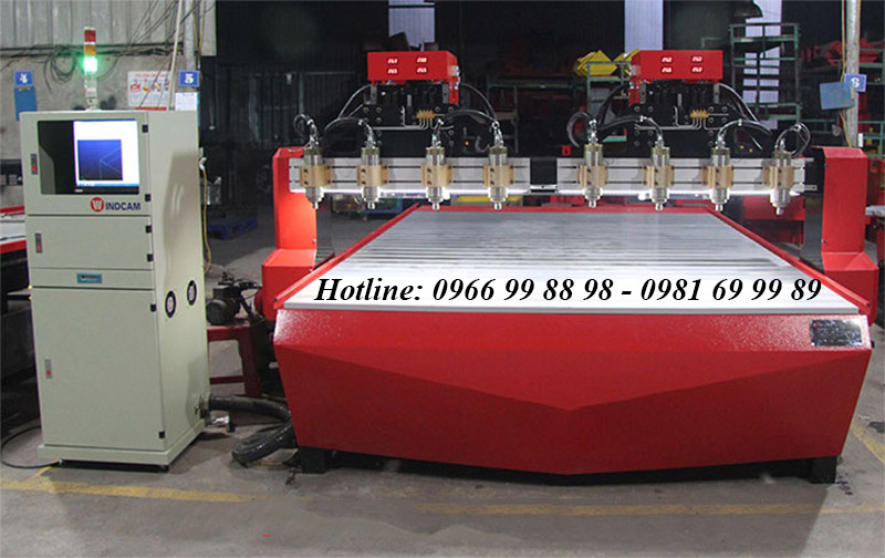 Máy CNC điêu khắc gỗ 6 đầu đục có kích thước mặt bàn làm việc 1m8 x 2m5 đáp ứng gần như mọi nhu cầu gia công gỗ của khách hàng, kể cả trong thời điểm cuối năm bận rộn