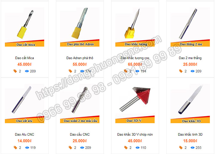 - Dao dùng trong quảng cáo ( 2D ). Bạn nên sử dụng các loại dao như: dao xoắn 1 me chuyên để cắt mica, MDF, fomex,.. Dao quả dứa dùng để phay, cắt những chi tiết nhỏ như bảng mạch, sừng, ngà, khoan đèn led,.. Dao alu để chuyên sử dụng cho nhu cầu cắt alu, ngoài ra nó có thể cắt mica mỏng <2mm. Dao inox để chuyên dụng cát trên inox.
