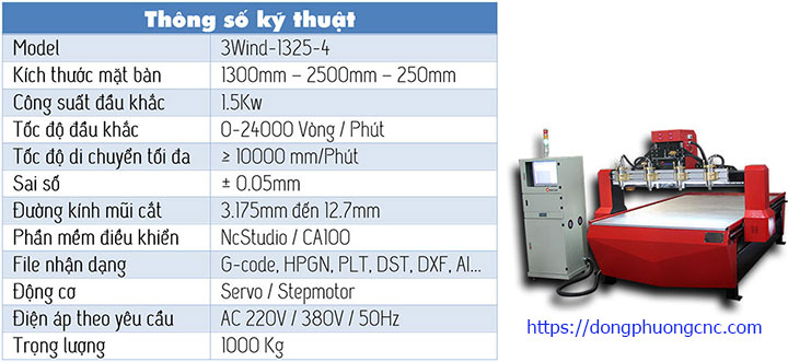 Trước hết nói về dòng máy cnc 3wind 1325-4. Thiết kế khổ mặt bàn làm việc của máy khổ thông dụng cơ bản 1m3 x 2m5. Sử dụng giao diện điều khiển bằng tiếng Việt. Công suất củ đục 1.5kW giúp bạn có thể đục sâu gỗ tối đa đến 4 phân. Ngoài ra bạn có thể nâng cấp củ đục công suất lớn hơn để giúp đục vật liệu sâu hơn. Thiết kể tiêu chuẩn phần vai máy cao 250mm. Giúp bạn có thể gia công các phôi vật liệu độ dày tối đa 200mm. Đặc biệt máy thiết kế tới tận 4 đầu đục Spindle giúp cho bạn có thể gia công cùng lúc tối đa 4 sản phẩm giống nhau trong cùng một khoảng thời gian. Điều này làm nâng cao năng suất chất lượng hiệu quả công việc của bạn lên đáng kể. Phù hợp với các cơ sở gia công sản xuất lớn.
