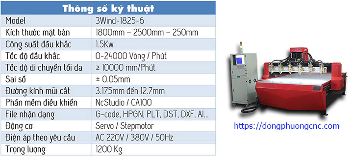 Tiếp đến nói về cấu hình của máy cnc 3wind1825-6. Cũng giống như thiết kế cơ bản chung của dòng máy cnc 3wind1325-4 ở trên. Thì dòng máy cnc 3wind1825-6 có thiết kế lớn hơn. Máy có thiết kế mặt bàn làm việc tiêu chuẩn khổ 1m8 x 2m5. Và được thiết kế tới tận 6 đầu khắc củ đục.